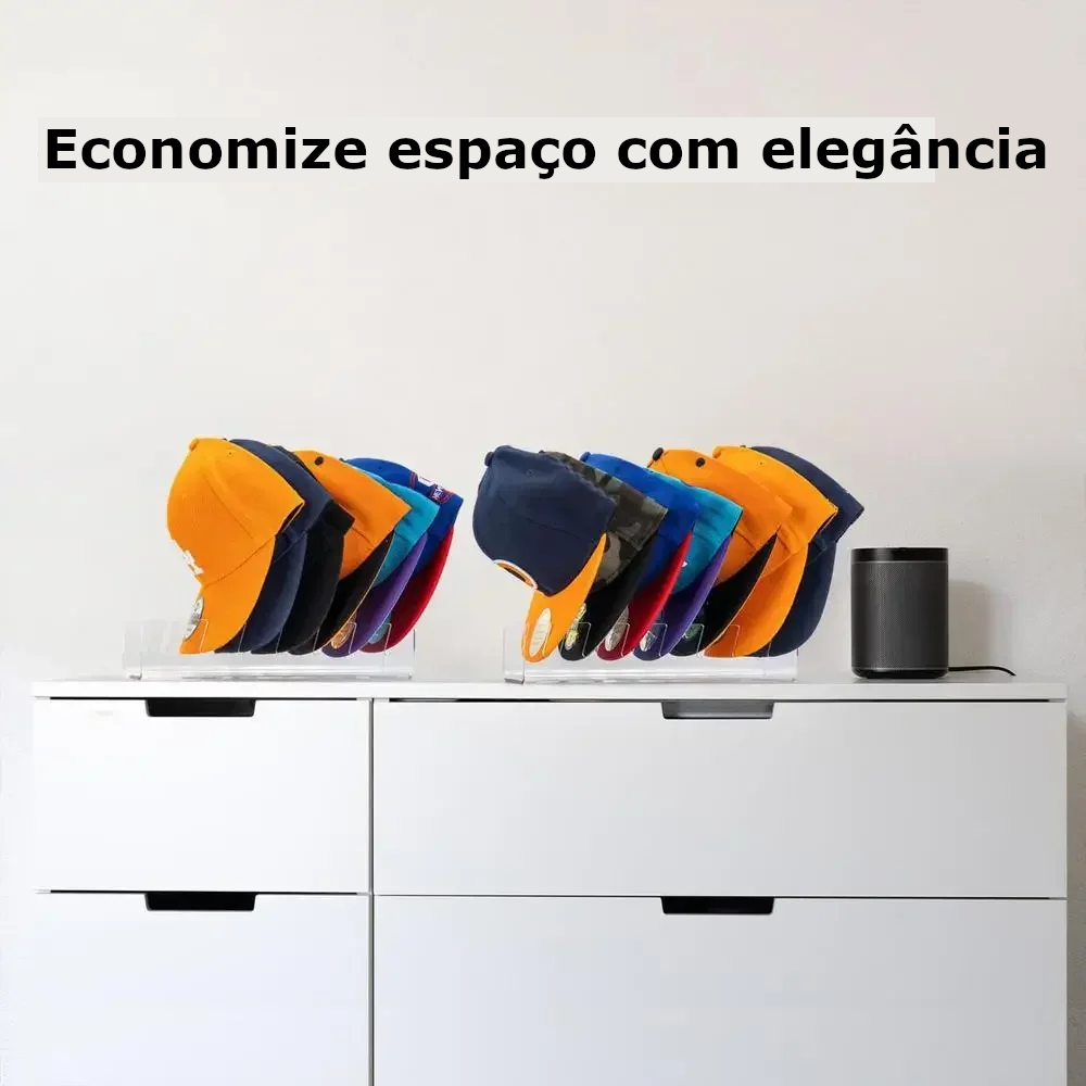 Economize espaço com este expositor de bonés em acrílico, perfeito para organizar e exibir sua coleção.